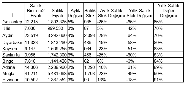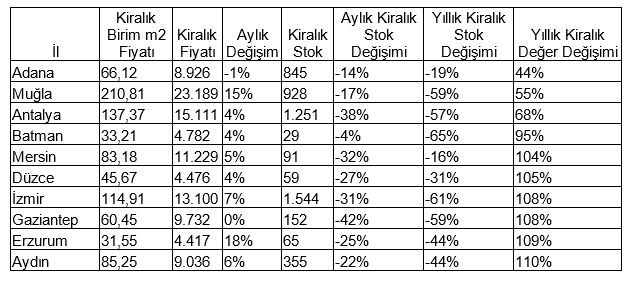 Urla, Çeşme, Antalya ve Muğla’da daha yüksek oranda değer artışı bekleniyor Türkiye’de son bir yılda kiralık konut değerlerinde en az yükselme görülen ilin %44’lük artışla Adana olduğunu da sözlerine ekleyen Öğüt, “Adana’da deprem bölgesine yakın ve çok göç alan bir ilimiz olmasına rağmen kritik bir artış gözlemlenmiyor. Adana’yı %55’lik artışla Muğla ve %68’lik artışla Antalya takip ediyor. Sıralanan iller arasında kiralık konut fiyatı ortalaması en yüksek olan il 23 bin 189 TL ile Muğla olurken, Düzce 4 bin 476 TL ile en düşük ortalama ile son sırada yer alıyor. Yaz dönemine girilmesiyle birlikte Muğla ve Antalya gibi turistik illerde aylık ortalama kira değeri değişimi yükselişe geçerken kiralık stok değerleri azalma gösterdi. Önümüzdeki üç ay boyunca bu bölgelerdeki kira değer değişiminin daha yüksek seviyelerde gözlemlenebileceğini söylemek mümkün. Yıllık değer değişim oranının diğer ille göre bir nebze düşük kalmasının sebepleri arasında bu illerimizdeki kira fiyatlarının doygunluk seviyesine yakın olması ve dönemsel ilgi görmesi sebebi ile yıllık ortalamasına bakıldığında, kış aylarının yaz dönemi seviyesinde seyretmemesinin getirdiği denge olduğu söylenebilir. Dönemsel olarak Urla, Çeşme, Antalya ve Muğla gibi yazlık bölgelerimizde önümüzdeki üç ay içerisinde diğer illerimizdeki konutlara göre daha yüksek oranda satılık ve kiralık değer artışı bekliyoruz. Stokların da azaldığını göz önünde bulundurursak bu bölgelere olan talebi daha net olarak gözlemleyebiliriz.” şeklinde konuştu.