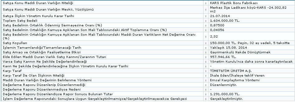 Türkiye Kalkınma Bankası, Kars'taki 24 bin 302 metrekare yüzölçüme sahip plastik fabrikasını Timet&Tim Üretim A.Ş.'ye sattı. Kars Ladiras Köyü'nde yer alan plastik boru fabrikasının satış bedeli 1 milyon 604 bin lira olarak açıklandı.