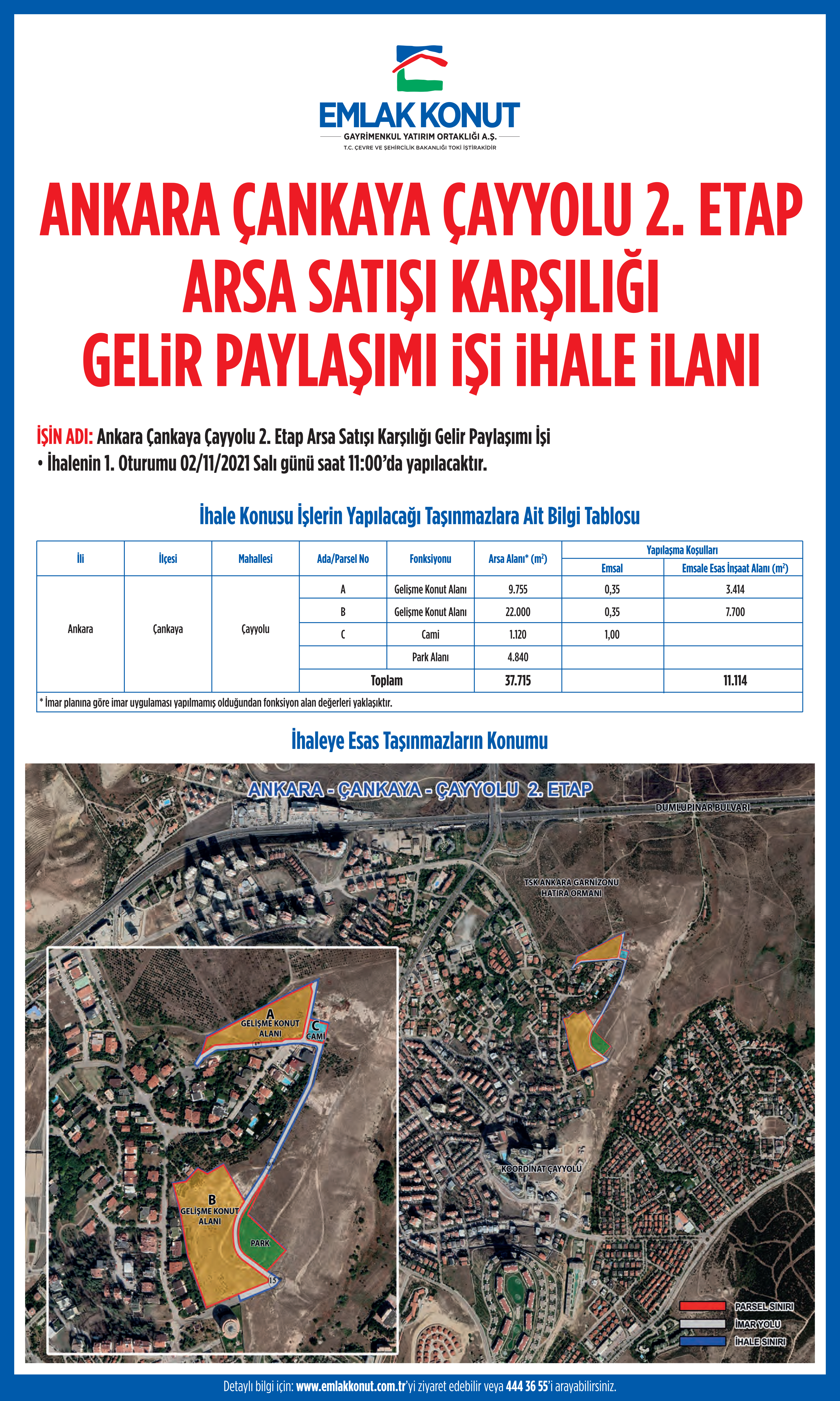 Emlak Konut GYO, Ankara Çankaya Çayyolu 2. Etap arsasını, arsa satışı karşılığı gelir paylaşımı modeliyle ihaleye açtı. 2 Kasım 2021 günü gerçekleştirilecek ihaleye konu parseller gelişme konut alanı, cami ve park alanından oluşuyor.