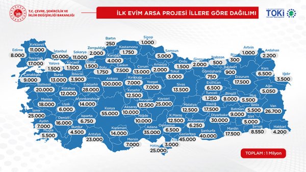 Kurum, 1 milyon konut amaçlı arsanın dağılımını illere ve ilçelere göre yaptıklarını belirterek, "81 ilimizde arsaların yüzde 40'ını şehir merkezlerinde, yüzde 60'ını ilçelerde olacak şekilde belirledik. Milletimizin istifadesine sunacağımız toplam 1 milyon konut amaçlı arsamızın bazı illerdeki dağılımını da paylaşmak isterim. 50 bin İstanbul'da, 100 bin Ankara'da, 25 bin İzmir'de, 45 bin Gaziantep'te, 55 bin Konya'da, 25 bin Kayseri'de, 30 bin Diyarbakır'da, 28 bin Eskişehir'de, 26 bin 700 Van'da, 23 bin Antalya'da olmak üzere 81 ilimizde 1 milyon konut amaçlı arsamızı vatandaşlarımızın hizmetine sunacağız." ifadesini kullandı.