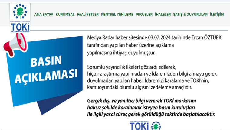 Mevzuat, kanun ve yönetmeliklere uygun olarak yapılan iş ve işlemlerimizle ilgili sorumlu yayıncılık ilkeleri göz ardı edilerek, hiçbir araştırma yapılmadan ve İdaremizden bilgi almaya gerek duyulmadan yapılan haber, İdaremizi karalama ve TOKİ'nin kamuoyundaki olumlu algısını zedeleme amaçlıdır. Gerçek dışı ve yanıltıcı bilgi vererek TOKİ markasını haksız şekilde karalamak isteyen basın kuruluşları ile ilgili yasal süreç gerek görüldüğü taktirde başlatılacaktır. Ayrıca kamuoyunun, bu tür asılsız haberlere itibar etmemeleri önemle duyurulur."