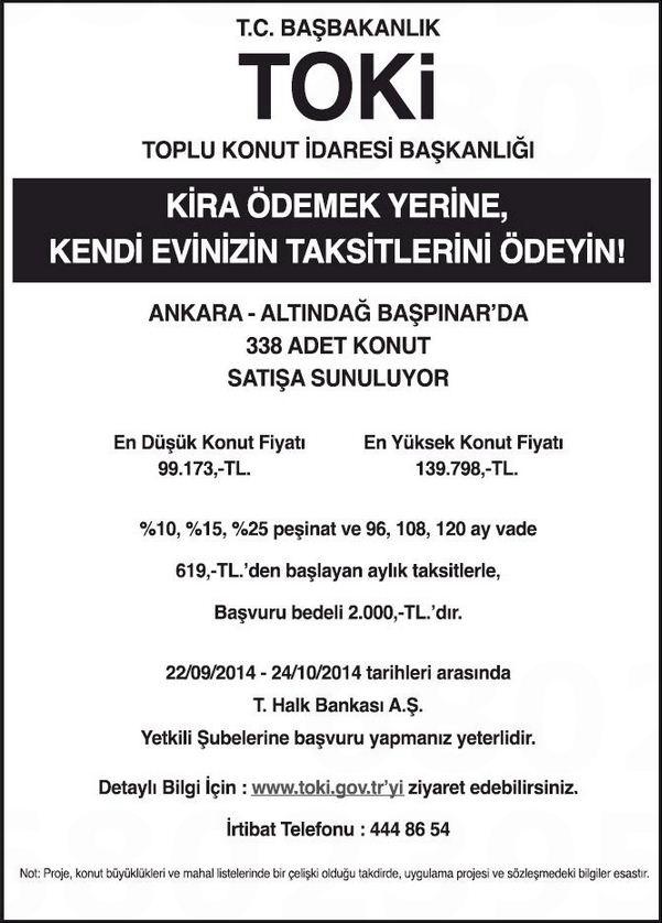 Başbakanlık Toplu Konut İdaresi Başkanlığı (TOKİ) Ankara Altındağ ilçesi Başpınar bölgesinde 338 konutu satışa çıkarıyor. Fiyatların 99 bin 173 lira ile 139 bin 798 lira arasında değiştiği projede yüzde 10, 15 ve 25 peşinat ödeyip konut sahibi olunabiliyor.