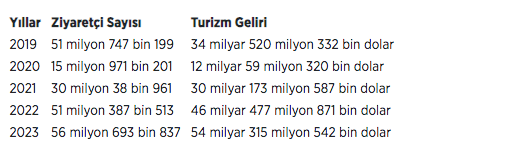 Türkiye'ye 2019-2023 arasındaki gelen ziyaretçi sayısı ile elde edilen turizm geliri ise şöyle: