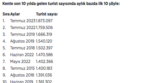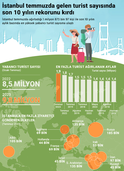 Geçen yıl temmuzda 1 milyon 759 bin 506 yabancı turistin ziyaret ettiği kent, bu temmuzda 1 milyon 873 bin 97 yabancı turisti ağırladı. Böylece temmuzda gelen yabancı turist sayısı geçen yıla göre yaklaşık yüzde 6 arttı. Verilere göre, bu yılın temmuzundan sonra İstanbul'a en çok turist 2022'nin aynı ayında geldi.