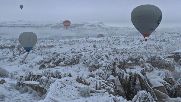 Kapadokya'da sıcak hava balonları, kar yağışının ardından beyaz örtüyle kaplanan peribacaları üzerinde süzüldü.