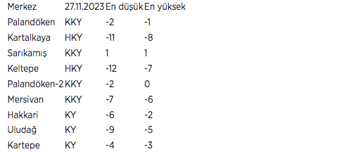 Bazı kayak merkezlerinde en düşük ve en yüksek hava sıcaklık tahminleri ise şöyle: