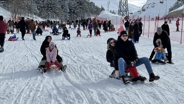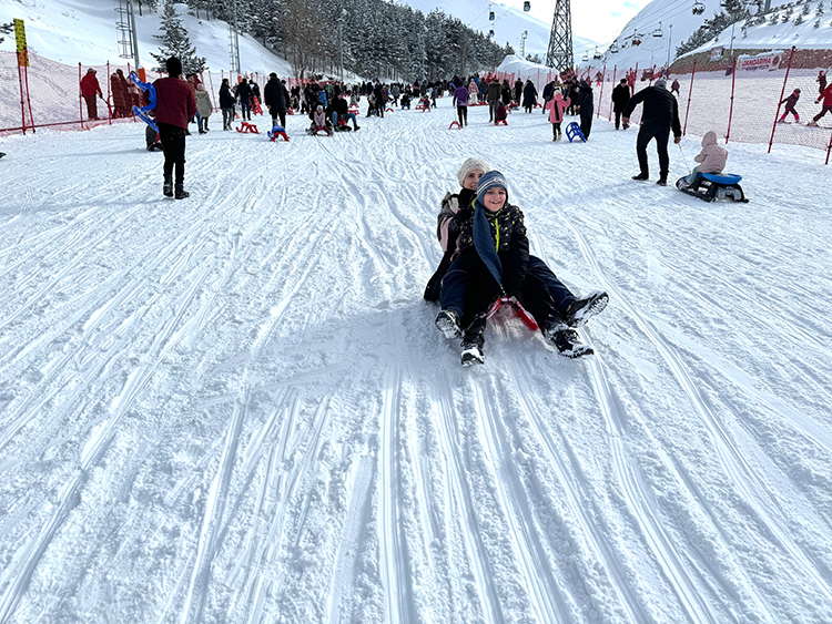 Kayak merkezine gelen aileler çocuklarıyla kızağa bindi, yerli ve yabancı turistler kayak ile snowboard yaparak eğlenceli vakit geçirdi.