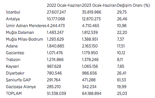 Türkiye'nin turizm cenneti destinasyonlarına ilgi havalimanı yolcu sayılarına yansırken, bu yılın ocak-haziran döneminde İstanbul Havalimanı 35,8 milyon, Antalya Havalimanı 12,9 milyon, İzmir Adnan Menderes Havalimanı 4,7 milyon yolcuya hizmet verdi.