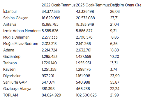 İstanbul Havalimanı, ocak-temmuz döneminde 43,3 milyon yolcuya hizmet vererek büyük bir talep gördü. Antalya Havalimanı ise 18,3 milyon yolcuya ev sahipliği yaparak turist akınına uğradı. İzmir Adnan Menderes Havalimanı da 5,8 milyonun üzerinde yolcuya hizmet sundu.