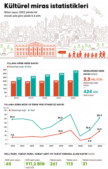 Türkiye genelinde müze sayısı, 2022'de bir önceki yıla göre yüzde 6,4 artarak 552'ye, müze ve ören yeri ziyaretçi sayısı da yüzde 97,1 artışla 45 milyon 822 bin 525'e yükseldi.