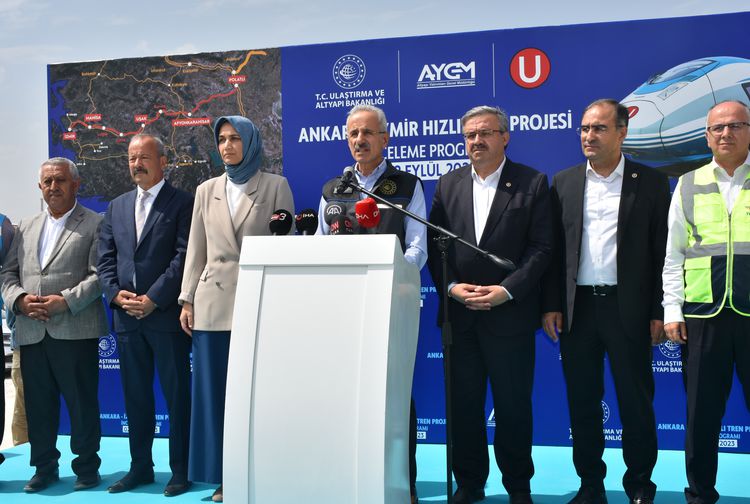 "Ankara merkezli yüksek hızlı tren ağının oluşturulması hedefi kapsamında yaklaşık 3 bin 800 kilometrelik demir yolu hattında da yapım çalışmaları devam etmektedir. Bizleri bir araya getiren Ankara-İzmir Hızlı tren hattımız da sanayisi, turizm potansiyeli ve limanıyla ülkemizin üçüncü büyük şehri olan İzmir'i ve güzergahtaki Manisa, Uşak ve Afyonkarahisar illerimizi Ankara'ya daha da yaklaştırarak, bölgedeki ticaret hacmini büyütecektir. Ankara - İzmir Hızlı Tren Projesi tamamlandığında mevcut demir yolu bağlantısıyla 824 kilometre olan mesafe 624 kilometreye inecektir. Ankara - İzmir arası 14 saat olan seyahat süresi 3 saat 30 dakikaya düşecektir. 9 istasyon ile Afyonkarahisar, Uşak, Manisa ve İzmir illerimizde yaşayan 7 milyondan fazla insanımız doğrudan hızlı tren konforuyla tanışacaktır. Kütahya gibi çevre illerle olan etkileşimi de dikkate alındığında YHT hizmetinden faydalanan nüfus daha da artacaktır."