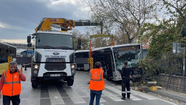 Kadıköy'de metrobüs belediyenin bahçe duvarına çarpıp asılı kaldı