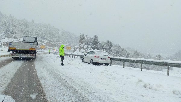 Konya'nın Seydişehir ilçesinde yoğun kar yağışı nedeni ile Konya-Antalya kara yolunda trafik kontrollü olarak sağlanıyor.