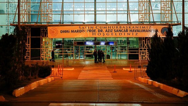 Başkan Recep Tayyip Erdoğan'ın Mardin Havalimanı'nın adının Mardin Aziz Sancar Havalimanı olarak değiştirileceğini açıklamasının ardından havalimanı girişine yeni isminin bulunduğu afiş asıldı.